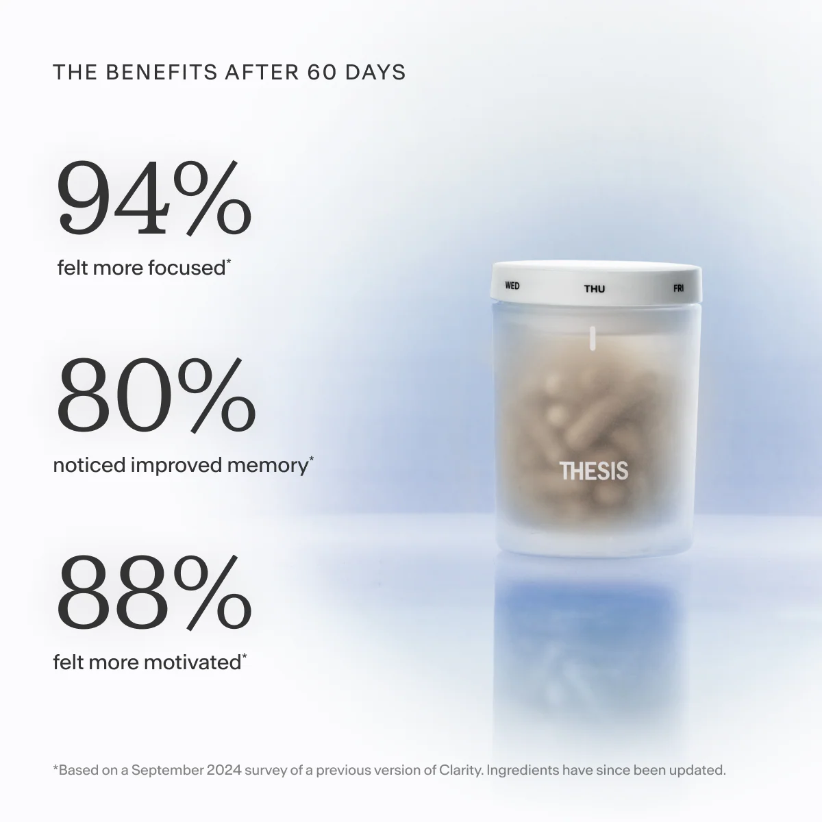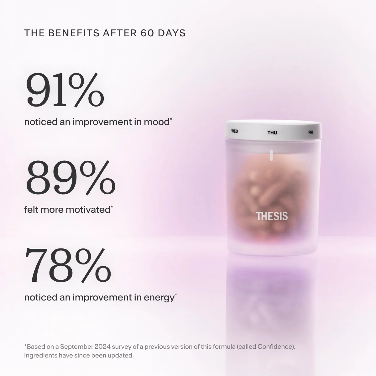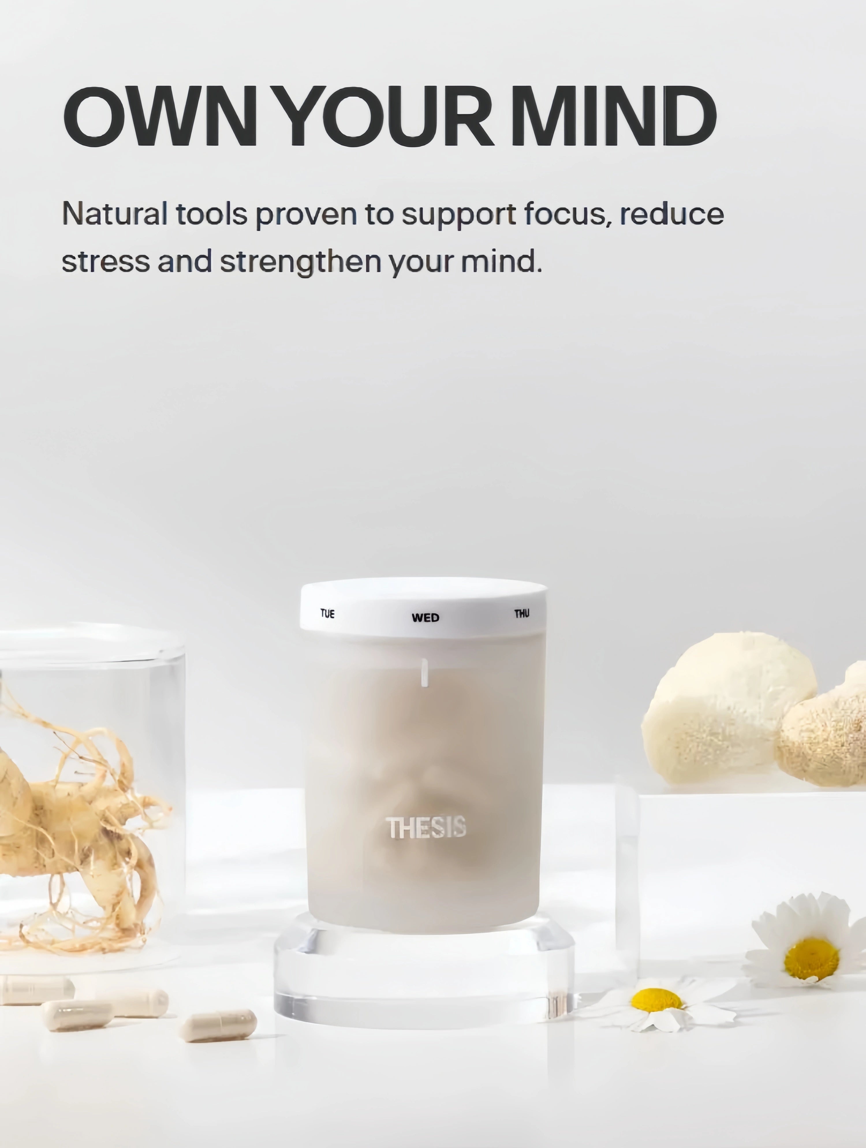 Instead of a one-size-fits-all approach, Thesis offers unique formulas made with clinically studied ingredients that complement one another to target different cognitive goals. Whether you’re looking to sharpen your working memory, boost mental clarity, or stay calm under pressure, there’s a formula to meet you where you are.