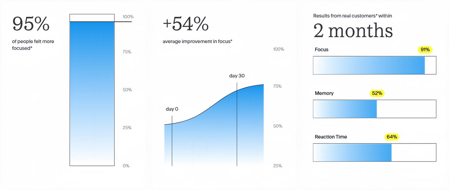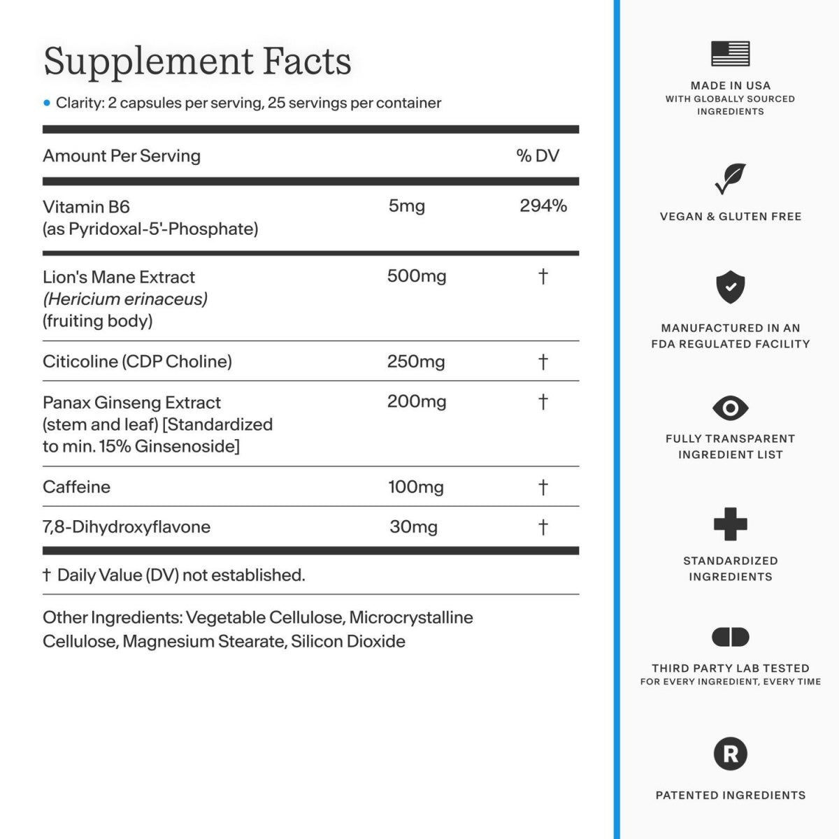 *These claims are based on a previous version of the Clarity formula. The data comes from an open-label consumer perception survey conducted in September 2024, which included at least 84 customers who had been using that version for 60 days or more. Participants received a $10 rebate for sharing their feedback. The previous formula included Lion’s Mane, Epicatechin, Alpha GPC, 7,8-DHF, and optionally caffeine and L-theanine. The formula has since been updated. A new study evaluating the current formula is planned, and updated claims are expected by December 2025.